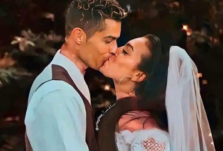 وتظهر جورجينا بفستان الزفاف الأبيض التقليدي، وهي تتبادل مع كريستيانو قبلة حميمية.