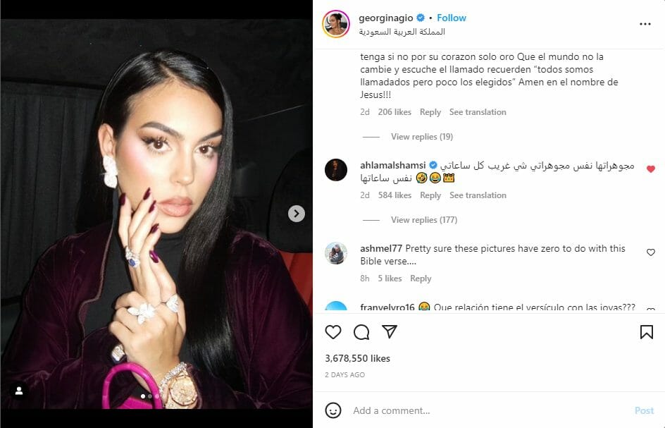 وكانت جورجينا رودريغيز قد نشرت صورة لها عبر حسابها على موقع الصور العالمي “إنستغرام“، في أثناء تواجدها في السعودية برفقة “رونالدو”، استعرضت فيها مجموعة من مجوهراتها وساعاتها الفخمة المطرزة بالألماس.