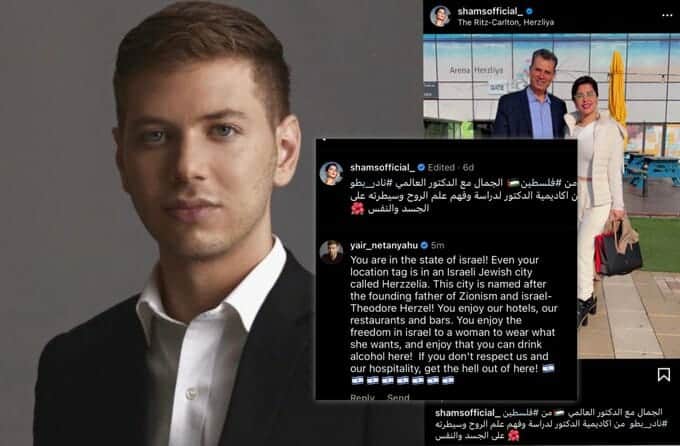 وردّ على تغريدتها التي كتبت فيها: “من فلسطين”، قائلاً: “أنت في إسرائيل. هكذا يشير أيضًا وسم موقعك في المدينة الإسرائيلية واليهودية “هرتسليا” نسبةً لاسم الأب الروحي للصهيونية وإسرائيل ثيودور هرتسل. وحيثما الآن تستمتعين بفنادقها ومطاعمها والحانات فيها”.