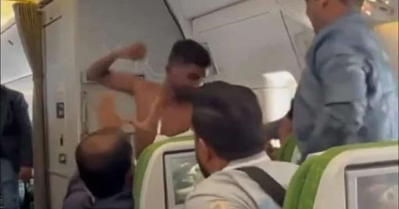 ونشرت صحيفة “ديلي ستار” الفيديو الذي يُظهر رجلاً عاري الصدر يتشاجر مع راكب آخر في جدال حول مقاعد الصف الأمامي في طائرة ركاب مكتظة.