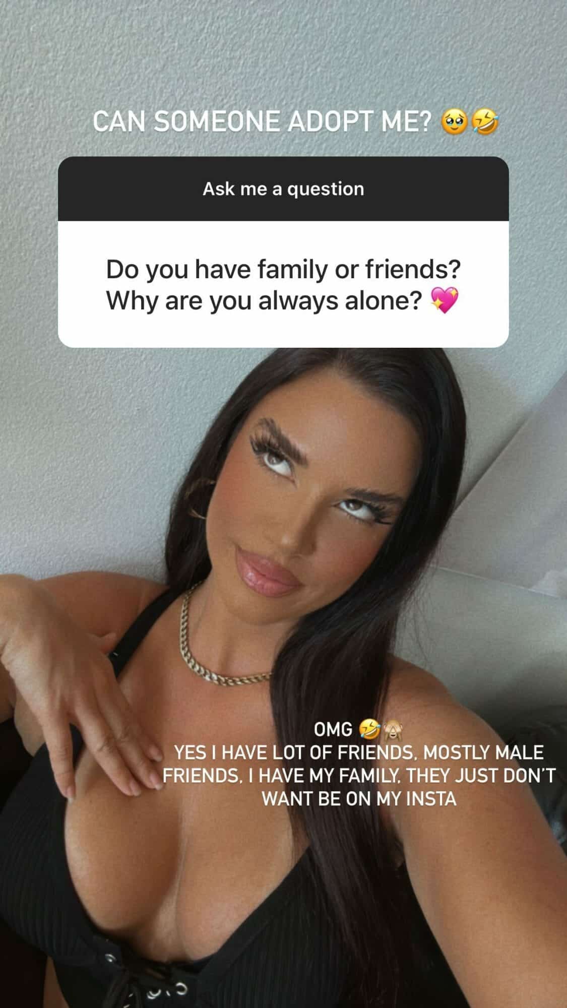 لكنها عبّرت لاحقاً عن صدمتها بالسؤال، وكتبت: “يا إلهي، نعم لدي أصدقاء كثيرون، معظمهم من الذكور. ولدي عائلتي أيضاً، لكنهم فقط لا يريدون الظهور عبر حسابي على انستجرام”.