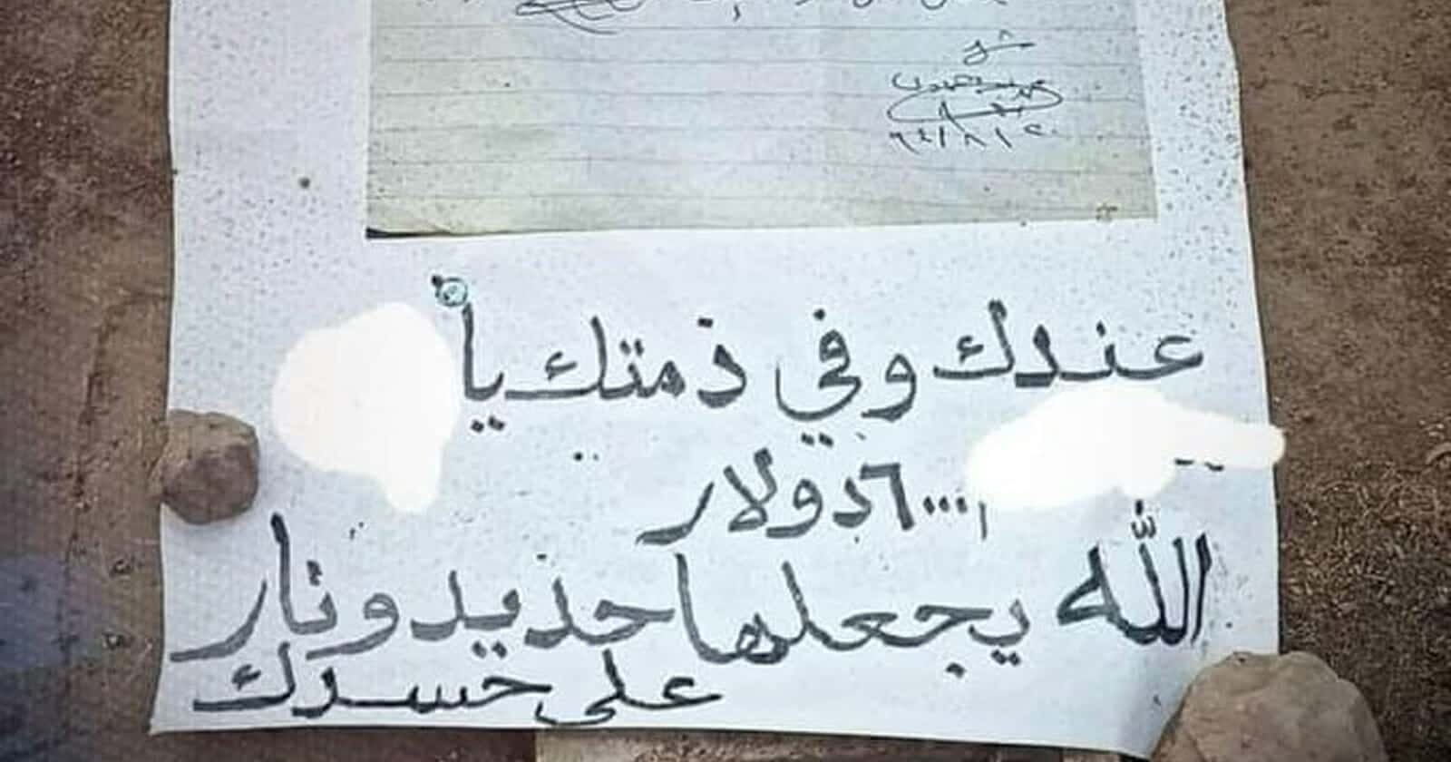 وألصق الشخص صاحب الرسالة “سند الدين الذي يعود إلى أيلول عام 1994″، على قبر المتوفى، وتحته عبارة كتبها بخط يده تقول: “عندك وفي ذمتك 6000 دولار الله يجعلها حديد ونار على جسدك”، فيما تم تمويه اسم المتوفى.