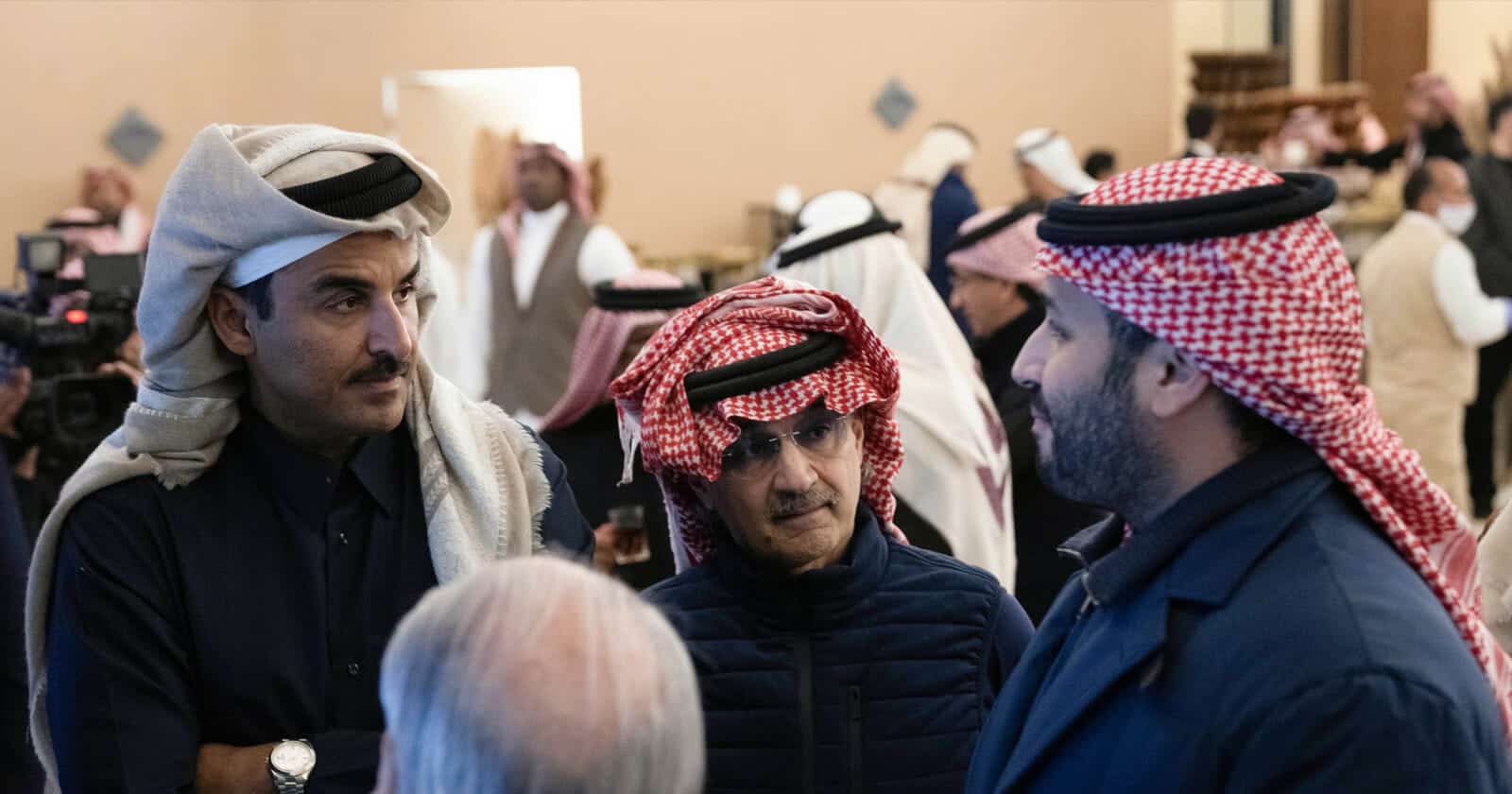 ورفقة عدد من المسؤولين داخل قاعة مغلقة خلال سباق الدرعية للفورمولا إي، بدا الوليد بن طلال وهو يصغي للكلام بين أمير قطر وولي العهد السعودي، ويهز برأسه دون أن يتدخل فيه.