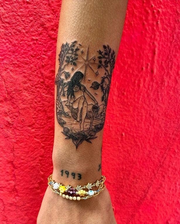 تجلس المرأة على أحد الكواكب وتسكب سائلًا في البركة، بينما يضيء نجم ضخم في الخلفية.