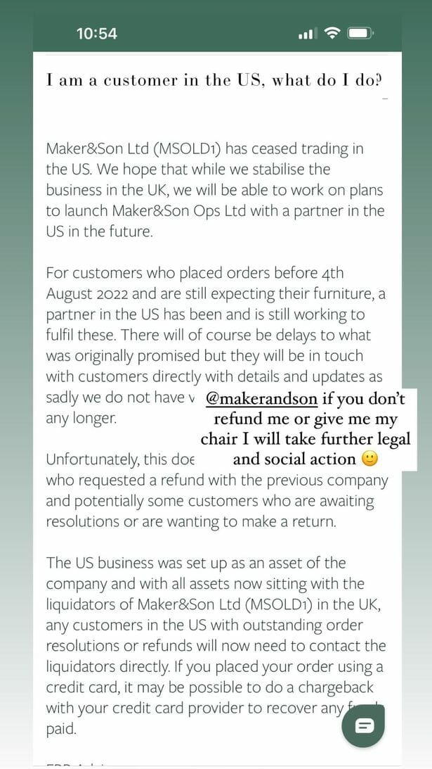 على موقع الويب الخاص بهم، يقولون: “في أكتوبر ، تم وضع شركة Maker & Son Ltd قيد الإدارة. وتم تصفيتها مؤخرًا كنتيجة لرسوم آمنة تحملها شركة باركليز على العمل. لسوء الحظ ، إلى جانب هذه العملية ، تم وضع جميع ودائع العملاء وأي مدفوعات تم إجراؤها إلى Maker & Son Ltd الآن”.
