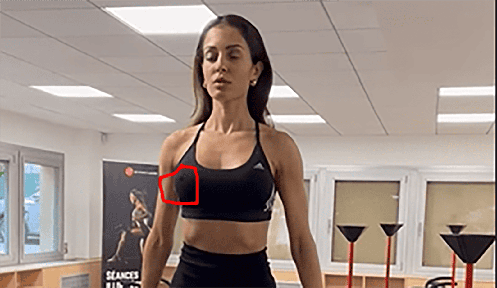 ولم يتوقف الأمر على ذلك، فقد أظهر الفيديو أن هبة عبوك لم ترتدِ حمّالة صدر في أثناء ممارسة التمارين، واكتفت بارتداء السترة الرياضية التي أظهرت أجزاءً حساسة من صدرها.