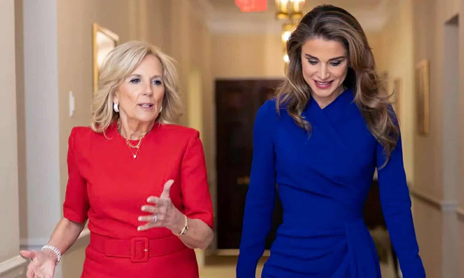 وكانت الملكة رانيا قد التقت قبل أيام بالسيدة الأولى للولايات المتحدة جيل بايدن، حيث بدت المرأتان مذهلتين في أثناء وقوفهما معًا لالتقاط الصور.