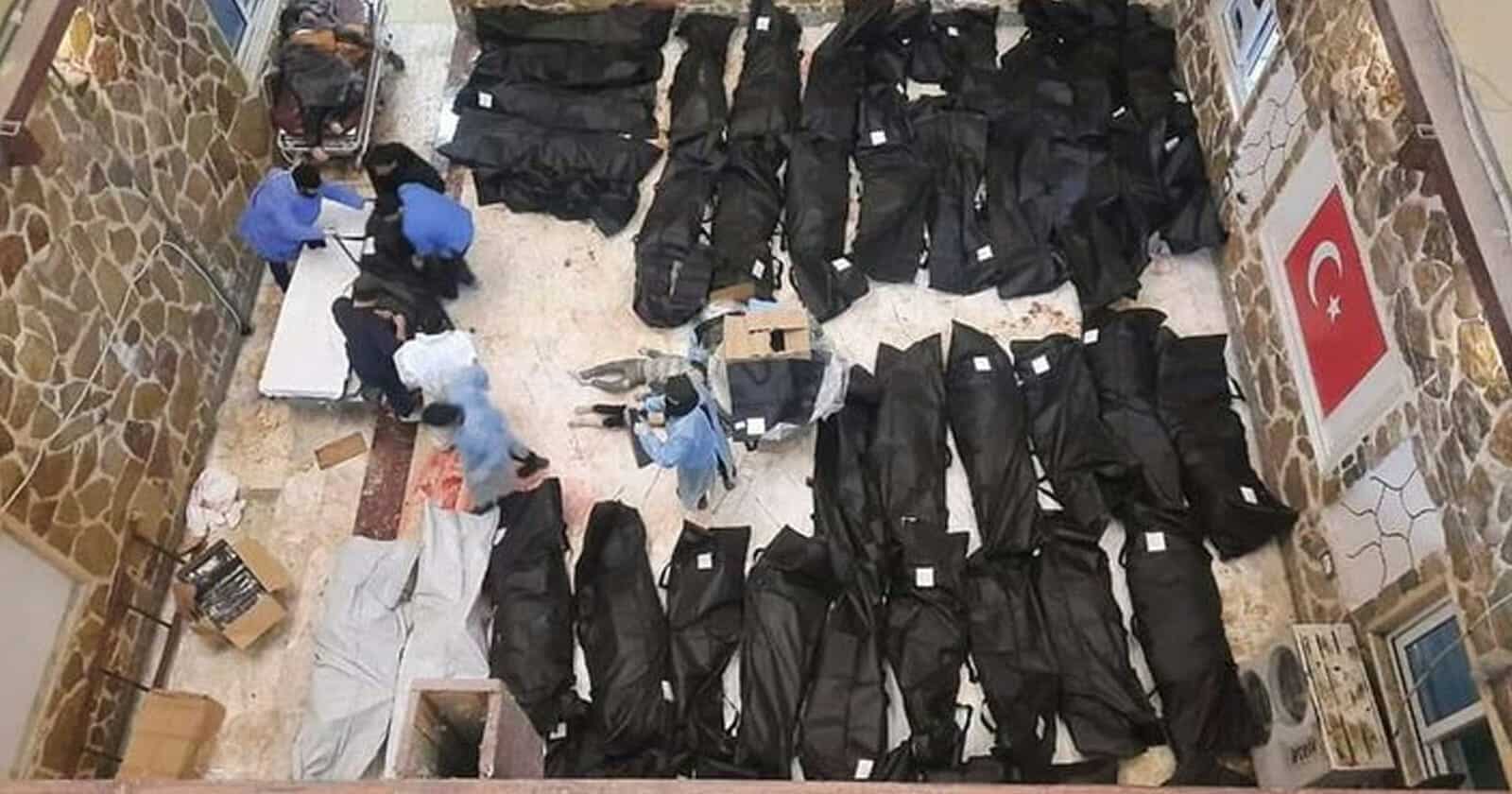 وأظهر مقطع فيديو متداول عشرات الجثث ملقاة في ممر أحد المشافي في عفرين ومغطاة، ويُسمع صوت المصور وهو يقول: “يالله لطفك بعبادك يا رب”.