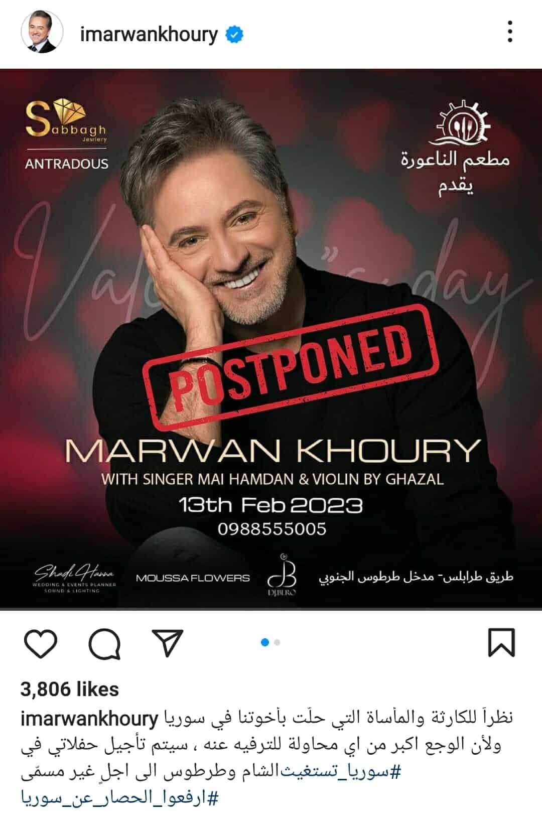 وكتب مروان عبر حسابه على انستجرام: “نظرًا للكارثة والمأساة التي حلت بأخوتنا في سوريا ولأن الوجع أكبر من أي محاولة للترفيه عنه. سيتم تأجيل حفلاتي في الشام وطرطوس إلى أجل غير مسمى”.