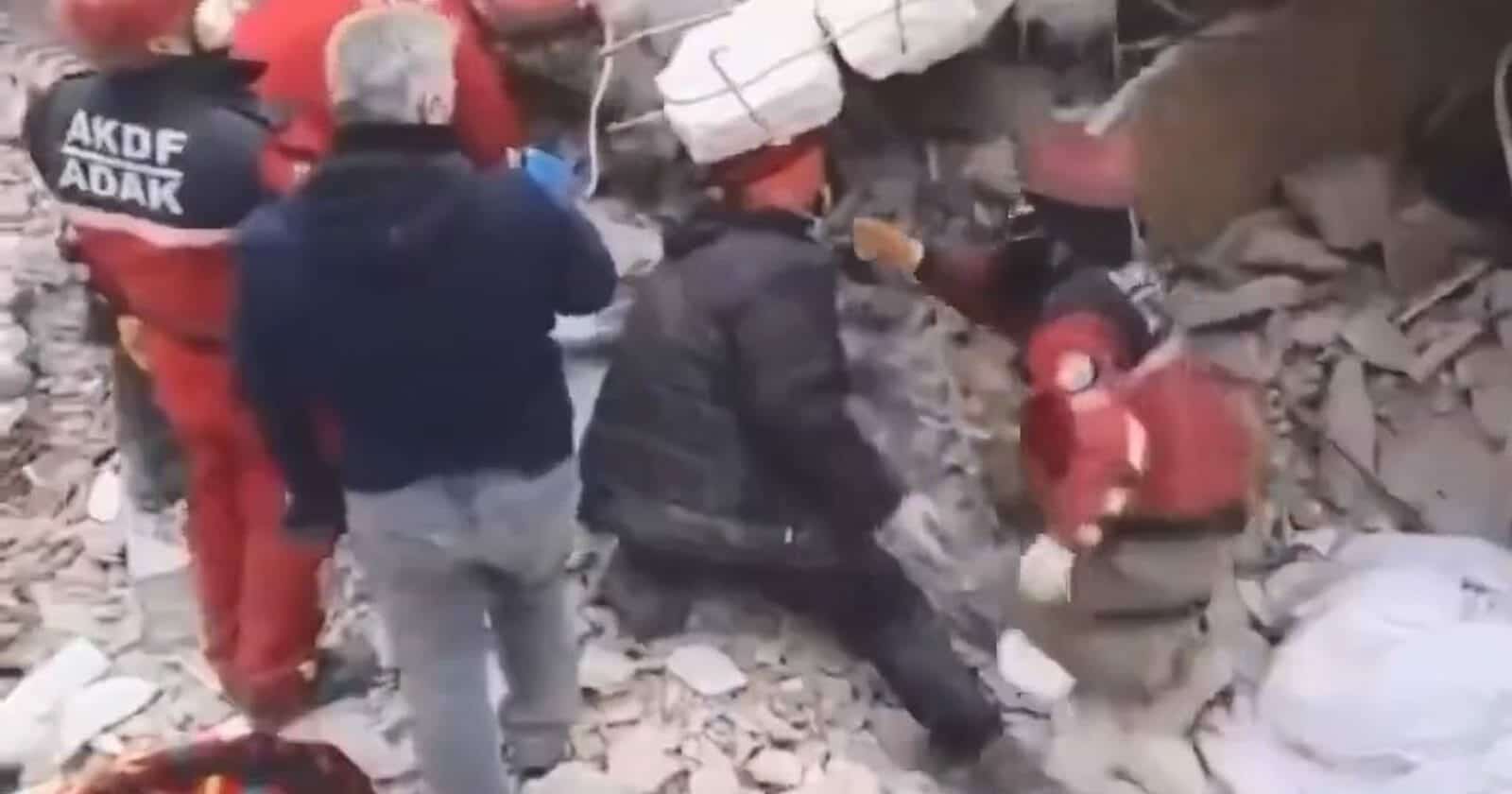 ووفقا للفيديو المتداول، فبنما كان فريق رجال الإنقاذ منهمكون في إزالة الأنقاض للبحث عن ناجين جراء الزلزال الذي ضرب تركيا وبعض المحافظات االشمالية السورية، انهارت عليهم الأنقاض من الأعلى.