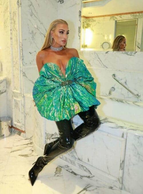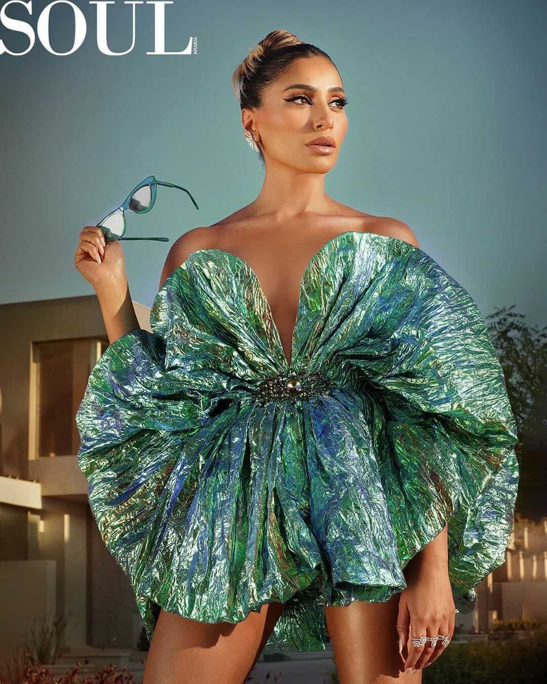 وظهرت دينا الشربيني بفستان أخضر غريب، قصير جداً ويكشف صدرها وساقيها، ولا يغطي سوى منطقة الوسط في جسدها.