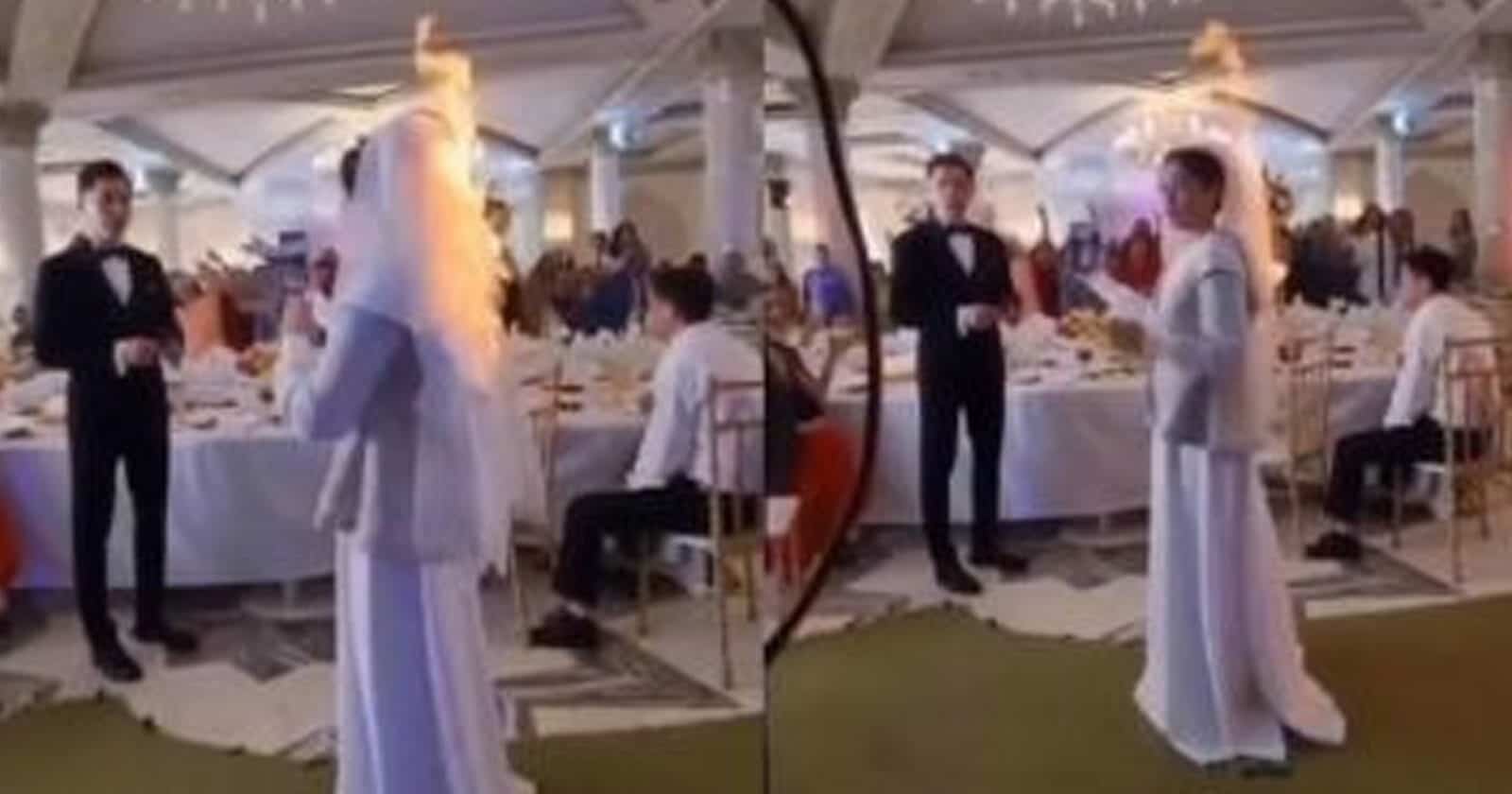 ويظهر بالفيديو، شخص يقوم بإشعال النار عبر “ولاعة”، في طرحة العروس.