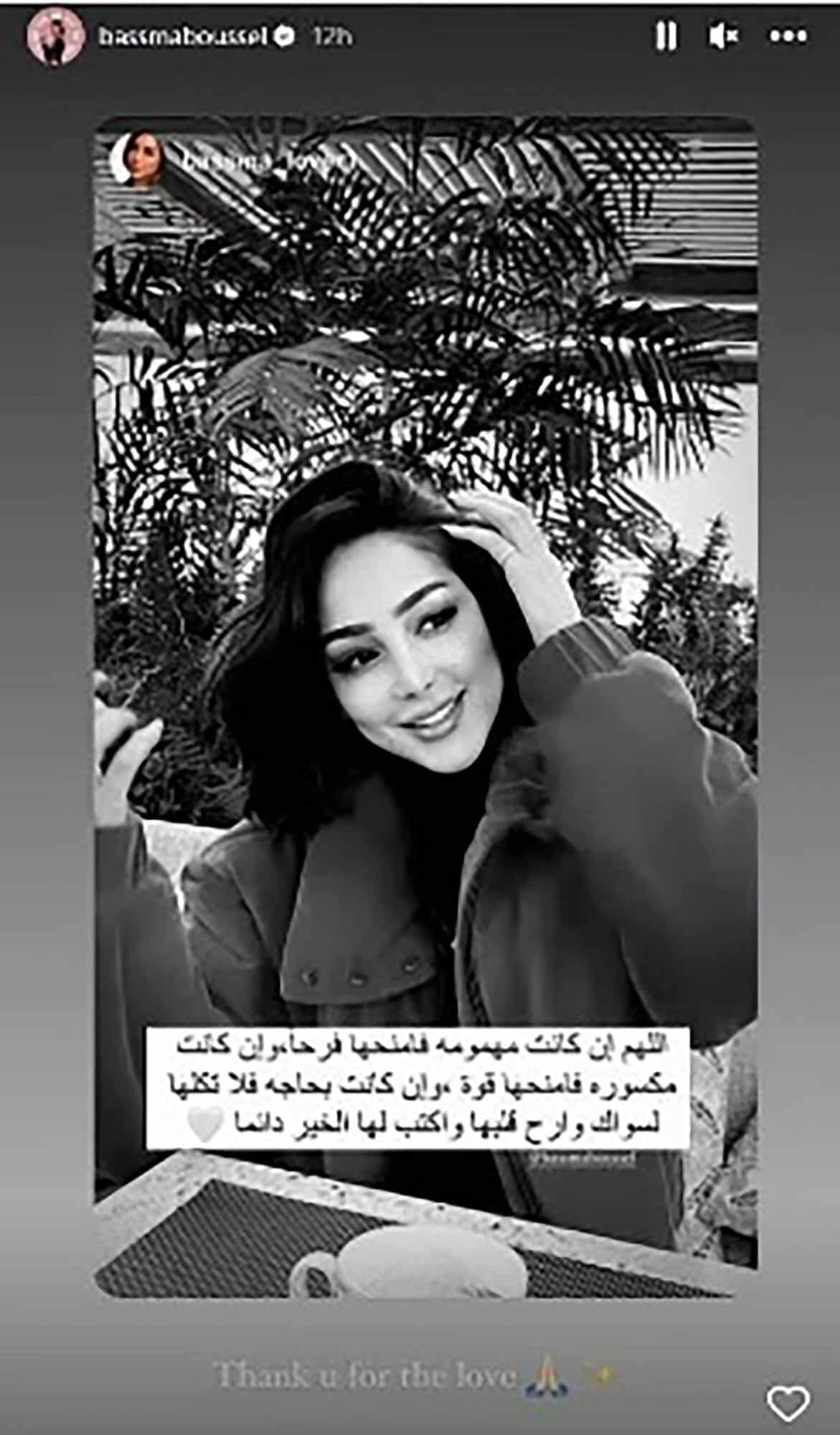 وشاركت زوجة تامر حسني، المغربية “بسمة بوسيل” على خاصية الاستوري عبر حسابها في “انستغرام”، بعضاً من منشورات المعجبين لمواساتها.