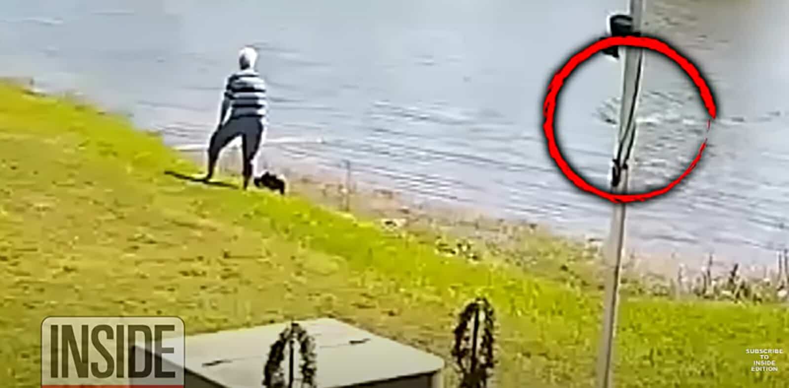 ويرى في الفيديو التمساح وهو يظهر على سطح الماء، ويقترب منها وكلبها.