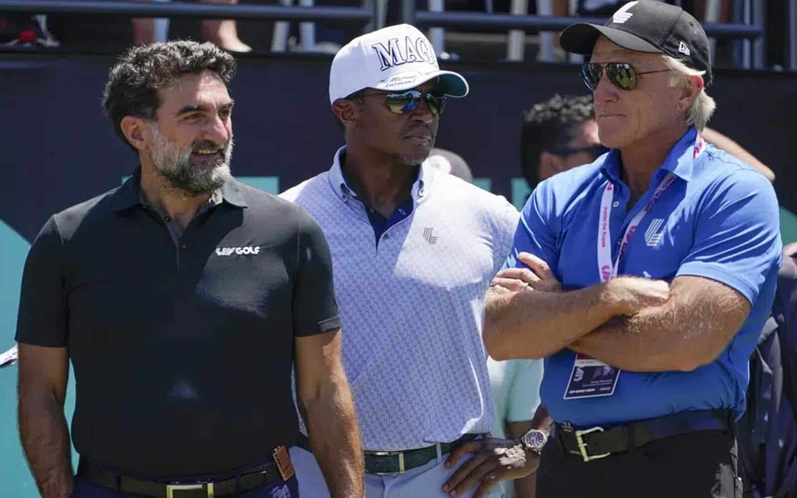 ياسر الرميان (يسارا) محافظ صندوق الاستثمارات العامة السعودية ، وماجد السرور ، الرئيس التنفيذي لشركة جولف السعودية وجريج نورمان الرئيس التنفيذي لشركة LIV Golf