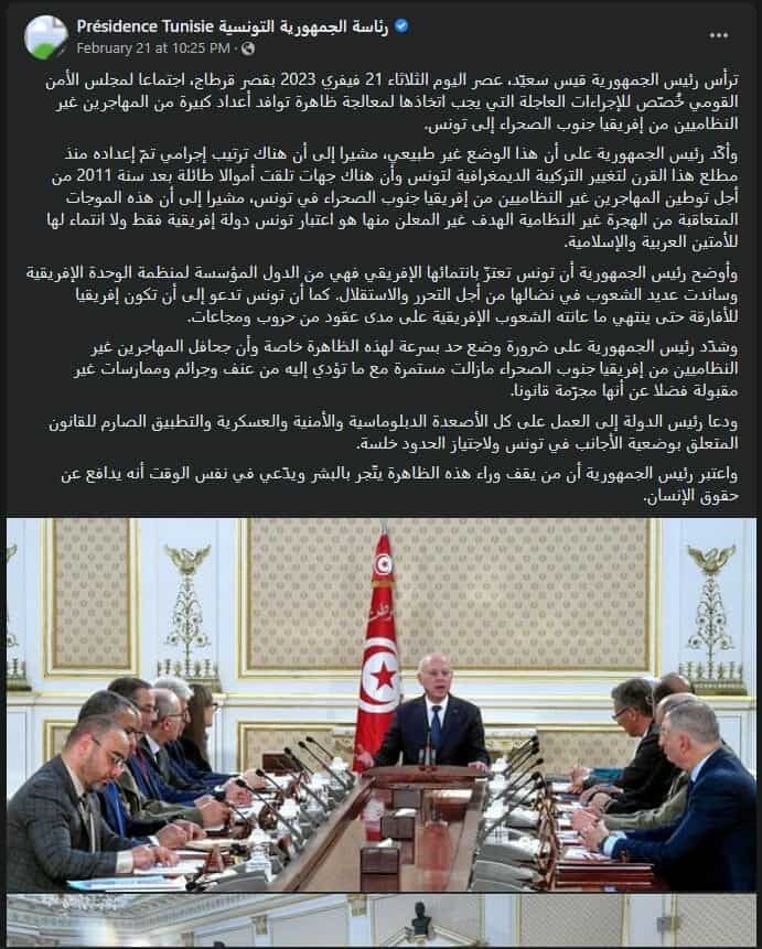 وجاءت تصريحات سعيّد خلال ترؤّسه في قصر قرطاج اجتماعاً لمجلس الأمن القومي، “خُصّص للإجراءات العاجلة التي يجب اتخاذها لمعالجة ظاهرة توافد أعداد كبيرة من المهاجرين غير النظاميين من إفريقيا جنوب الصحراء إلى تونس”، وفق بيان للرئاسة التونسية.