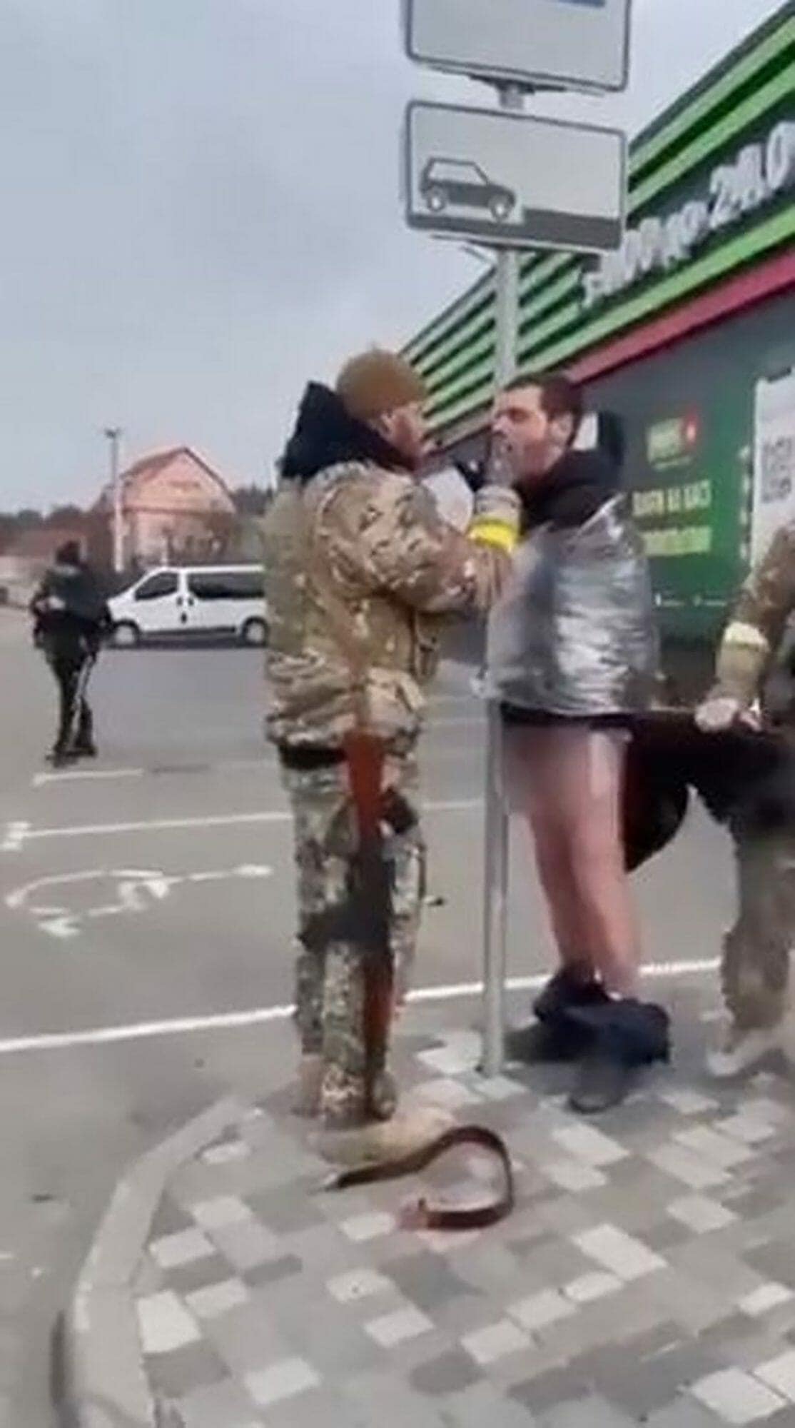 ويُظهر مقطع فيديو رجالاً يحملون السلاح يرتدون الزي العسكري ويأخذون القانون بأيديهم من خلال ربط زوج من الرجال بأعمدة مختلفة في الشارع.