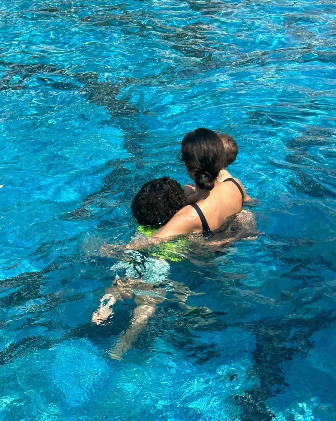 كما ارتدت زوجة أشرف حكيمي، في تلك الرحلة أيضاً، بكيني أسود من قطعتين، كشف جسدها بشكل واضح.