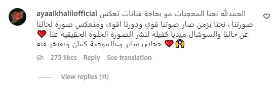 وقالت إحدى المعلّقات على منشور “عديلة”: “الحمدلله نحنا المحجبات مو بحاجة فنانات تعكس صورتنا. نحنا بزمن صار صوتنا قوي ودورنا اقوى ومنعكس صورة لحالنا عن حالنا. والسوشال ميديا كفيلة لنشر الصورة الحلوة الحقيقية عنا . حجابي ساتر وعالموضة كمان وبفتخر فيه”.