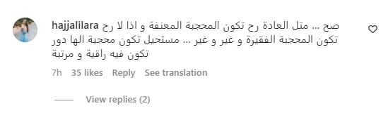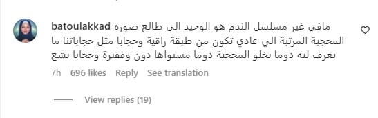 كما شاركتها الرأي متابِعةٌ، وقالت: “صح … متل العادة رح تكون المحجبة المعنفة. و اذا لا رح تكون المحجبة الفقيرة و غير و غير … مستحيل تكون محجبة الها دور تكون فيه راقية و مرتبة”.