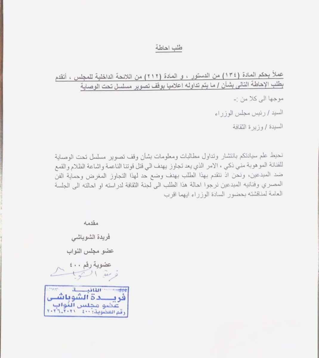 في هذا السياق، تقدّمت فريدة الشوباشي عضو مجلس النواب المصري، بطلب إحاطة للدكتور مصطفى مدبولي رئيس مجلس الوزراء، ووزيرة الثقافة نيفين الكيلاني، بشأن مطالبات بعضهم بوقف تصوير مسلسل “تحت الوصاية”.