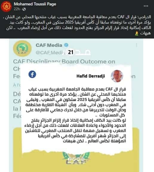 من جانبه، قال المعلق الجزائري حفيظ دراجي، إن قرار الكاف بعدم معاقبة الجامعة المغربية بسبب غياب منتخبها المحلي عن الشان، يؤكد مرة أخرى ما توقّعه سابقاً بأن كأس إفريقيا 2025 ستكون في المغرب بدون أي شك.