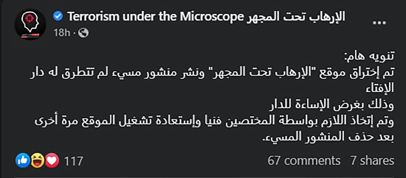وقال في تدوينة مبرّراً ما حدث بالقول: “تنويه هام: تم إختراق موقع “الإرهاب تحت المجهر” ونشر منشور مسيء لم تتطرق له دار الإفتاء وذلك بغرض الإساءة للدار”.