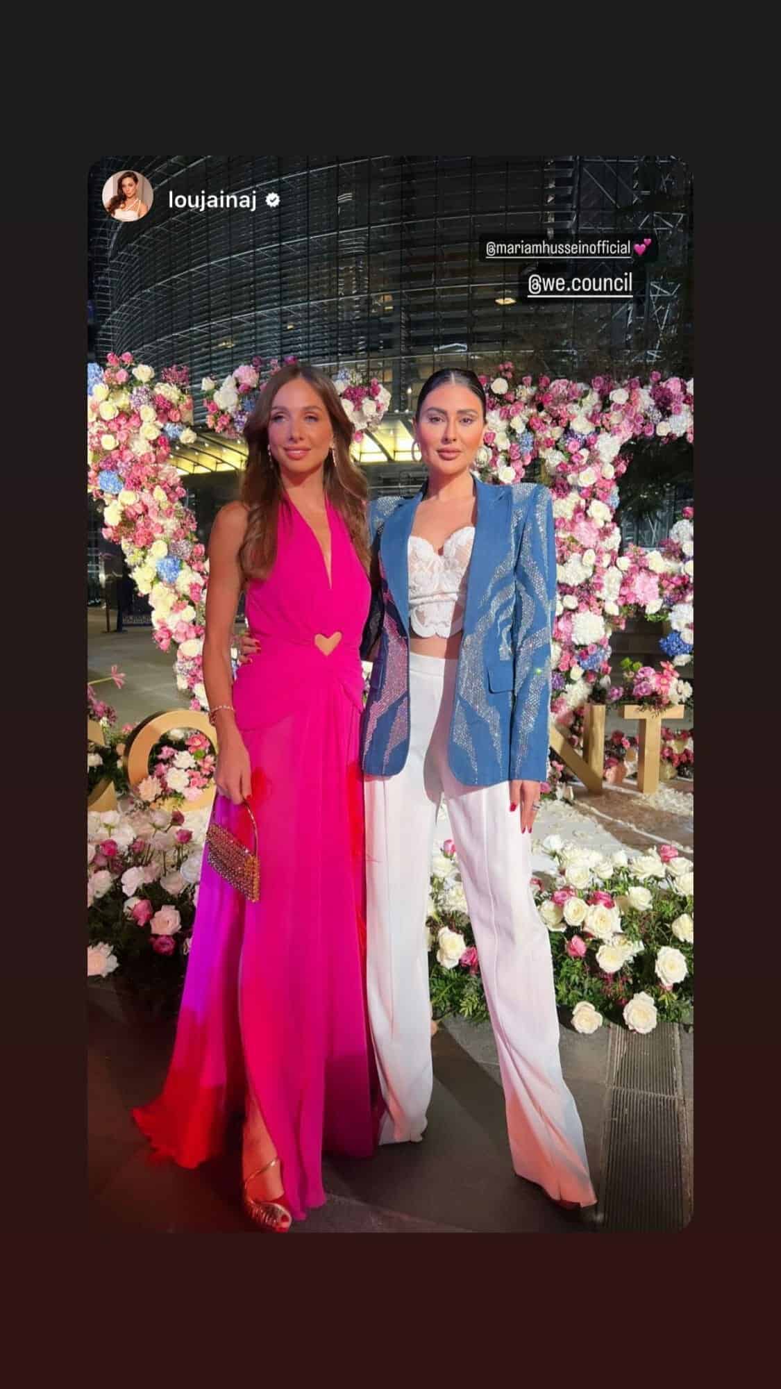 كما نشرت مريم حسين صورتها مع نجمة “دبي بلينغ“، لجين عضاضة التي تألقت بفستان زهري لافت.