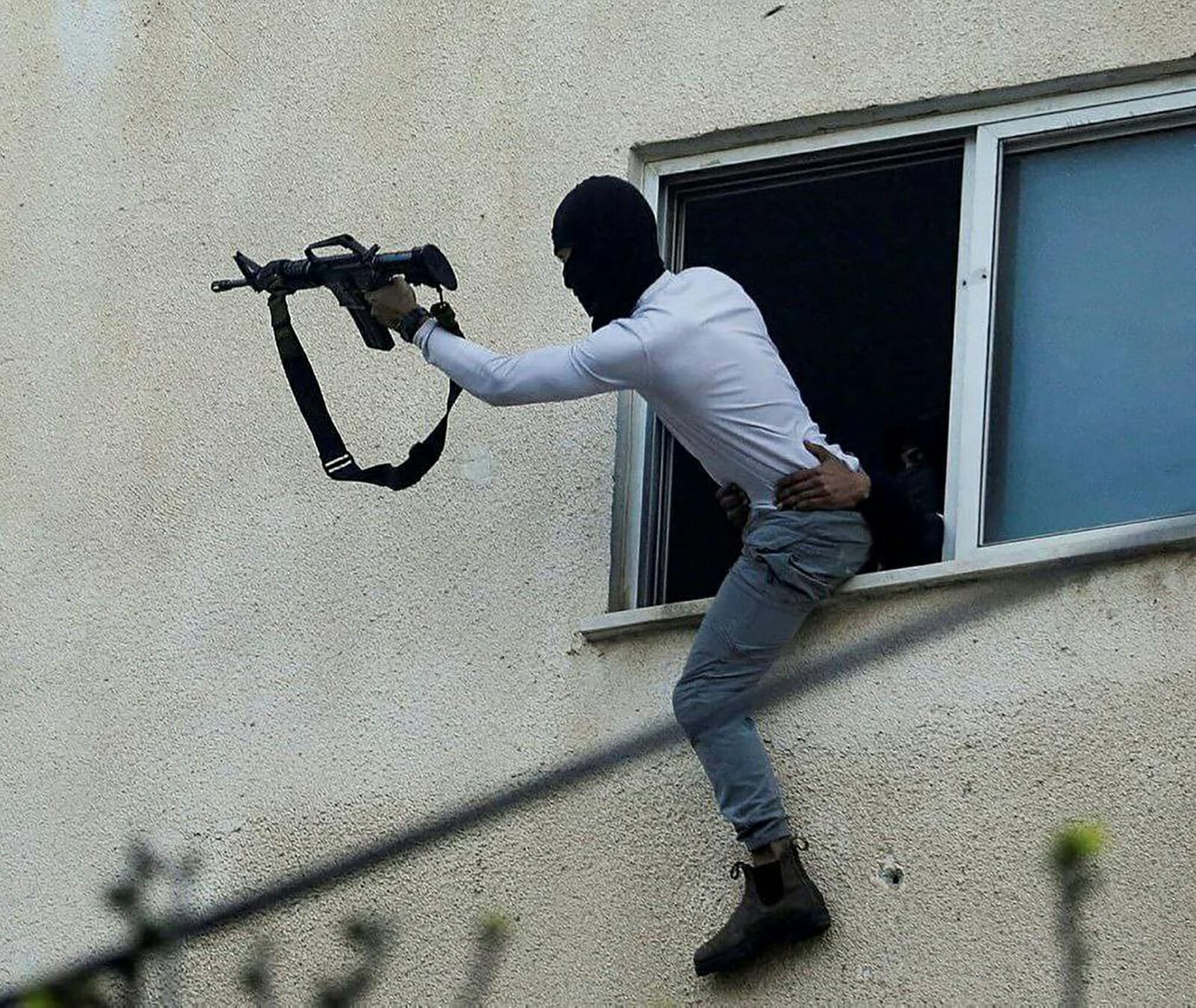 الصورة أظهرت مقاوماً فلسطينياً، وهو يشتبك مع جنود الاحتلال، في مدينة جنين، وهو يُطلّ من نافذة في طابق علوي.