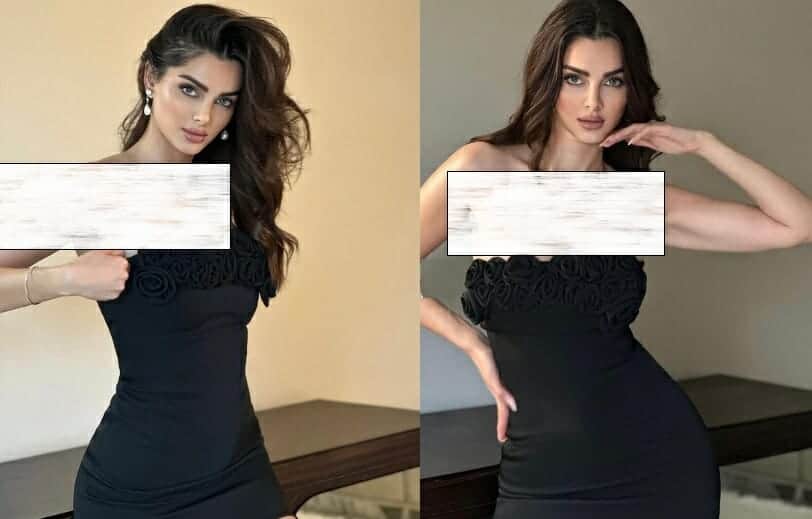وظهرت عارضة الأزياء الإيرانية ماهلاغا جابري بإطلالة جريئة، حيث ارتدت فستاناً أسود اللون، قصيراً يكشف فخذيها وصدرها.