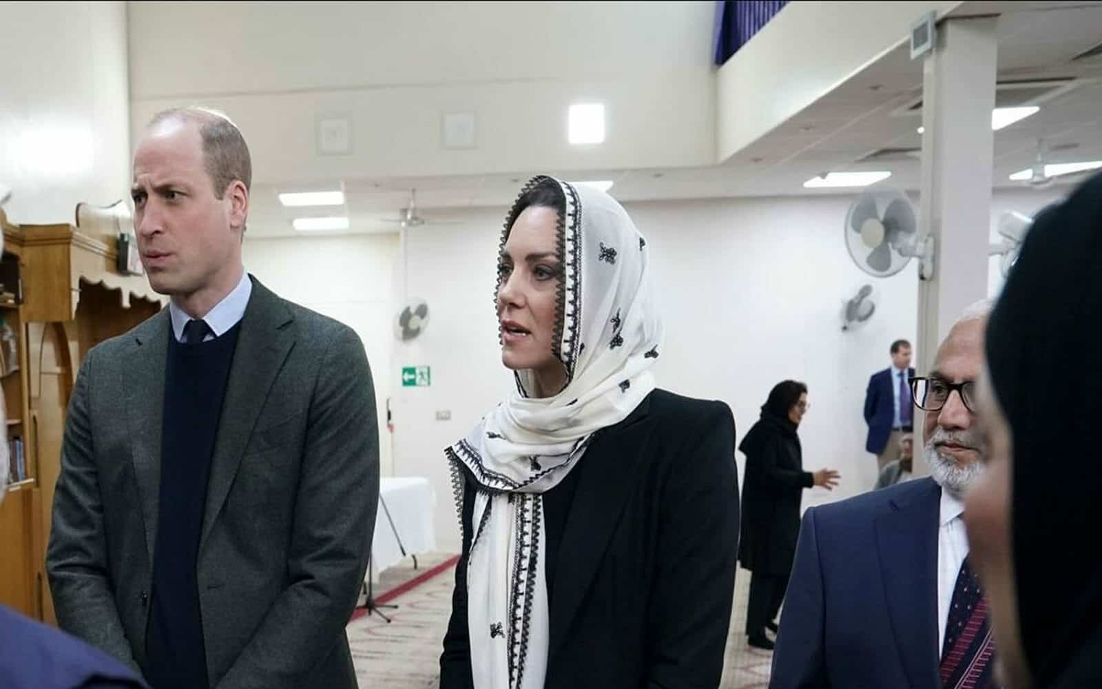 وكدليل على الاحترام، خلع أميرا ويلز أحذيتَهم، وغطت كيت، من جانبها، رأسها بحجاب أسود وأبيض من ماركة إيلان الباكستانية، بلمسة عربية، وهو جزء من مجموعة ارتدتها زوجة ملك إنجلترا المستقبلي بالفعل في رحلة عام 2019.