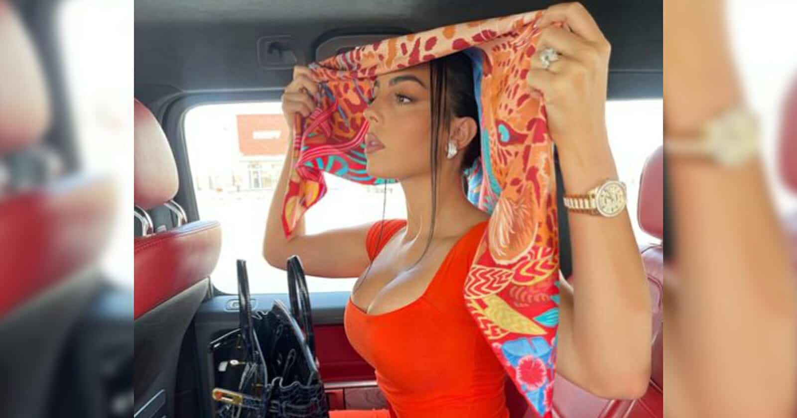 جورحينا رودريغز غطت طرف شعرها بقماش مزين بالألوان، وقد أمسكت طرفيه بين يديها، بينما أظهرت مفاتنها لمتابعيها وكشفت عن جمالها.