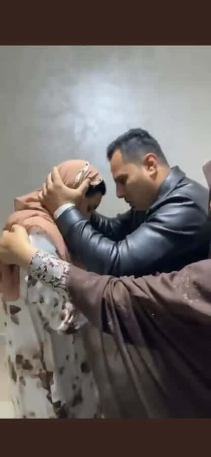 ويبدأ الزوج بمحاولة مصافحة زوجته وتقبيلها من رأسها، لكنها تحاول الابتعاد عنه.
