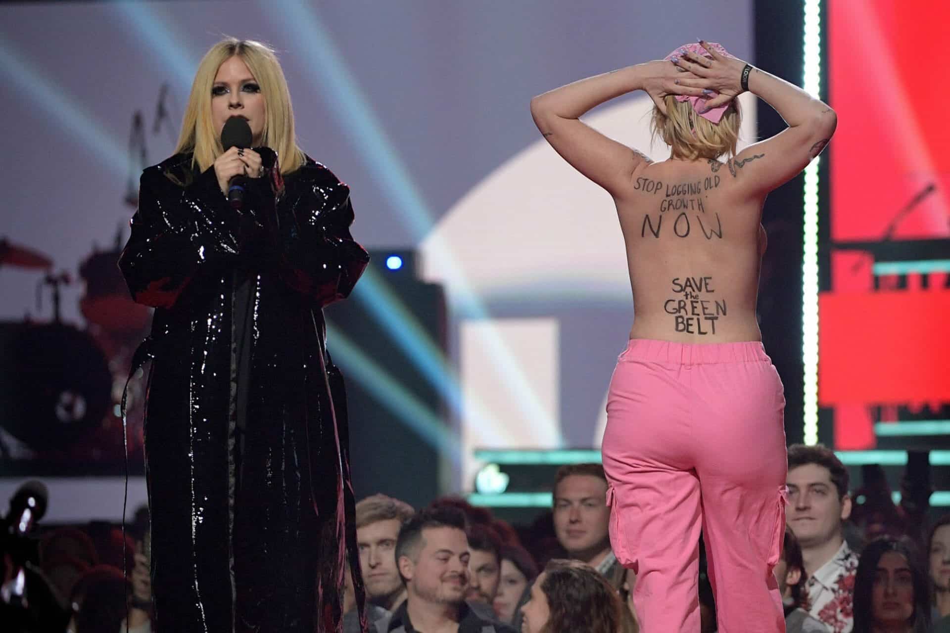 وطن- اقتحمت امرأة “عارية الصدر” حفل جوائز جونو، وعطّلت فترة تقديم المغنية الكندية أفريل لافين للنجم AP Dhillon، الذي كان من المفترض أن يقدّم عرضاً.