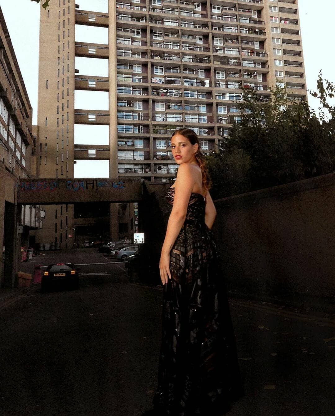 وظهرت جنا عمرو دياب في الصور، وهي ترتدي فستاناً أسود أوف شولدر، كشف الجزء الأعلى من جسدها.
