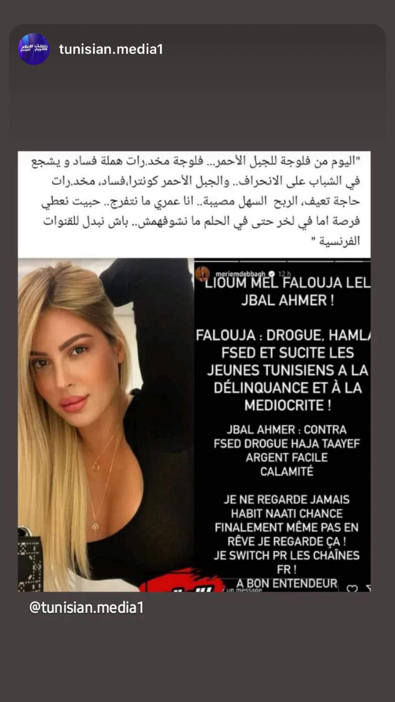 وتابعت الدباغ هجومها على المسلسل: “يشجّع شباب تونس على الإنحراف و الجبل الأحمر: كونترا، فساد و مخدرات حاجة تعيّف ..ربح سهل مصيبة”.