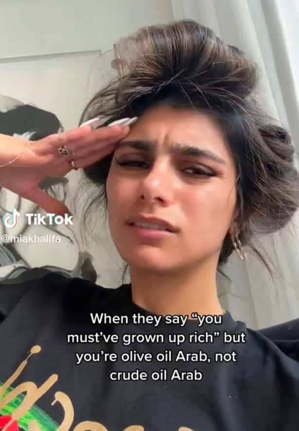 وجاء في تعليق ميا الذي نشرته على الشاشة: “عندما يقولون لي لا بد أنك نشأتي غنية.. لكنني من بلاد زيت الزيتون ولست من بلاد زيت النفط”.