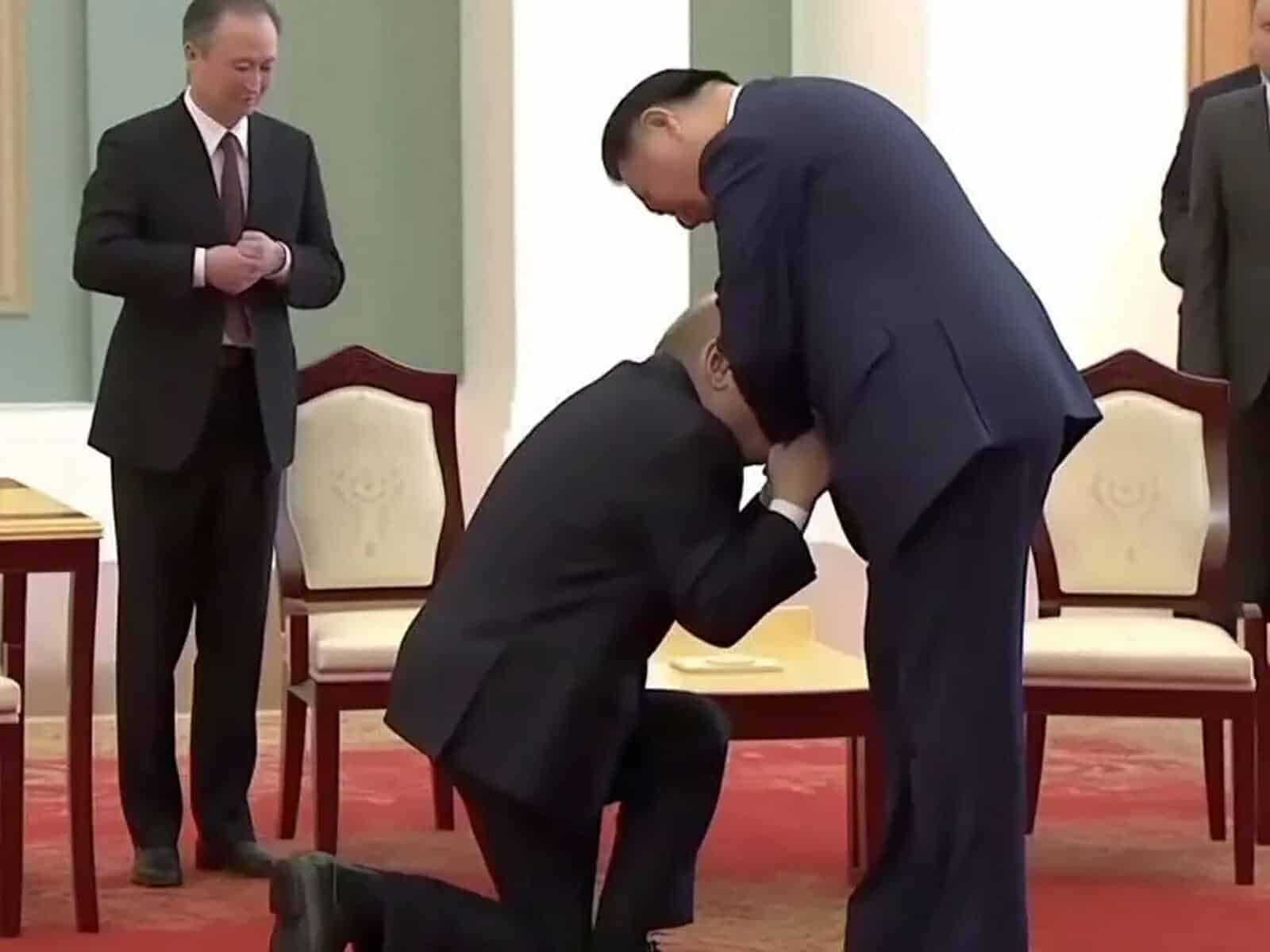 وانتشرت خلال الأيام القليلة الماضية، صورة زعم ناشروها أنها للرئيس الروسي فلاديمير بوتين وهو راكع على ركبتيه، ويقبّل يد نظيره الصيني شي جين بينغ، خلال زيارة الأخير لموسكو قبل أيام.