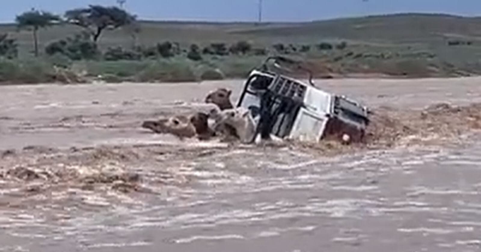 وأظهر مقطع فيديو متداوَل على وسائل التواصل الاجتماعي، المركبة وهي منقلبة وسط سيل قوي وبداخلها مجموعة من الجمال.