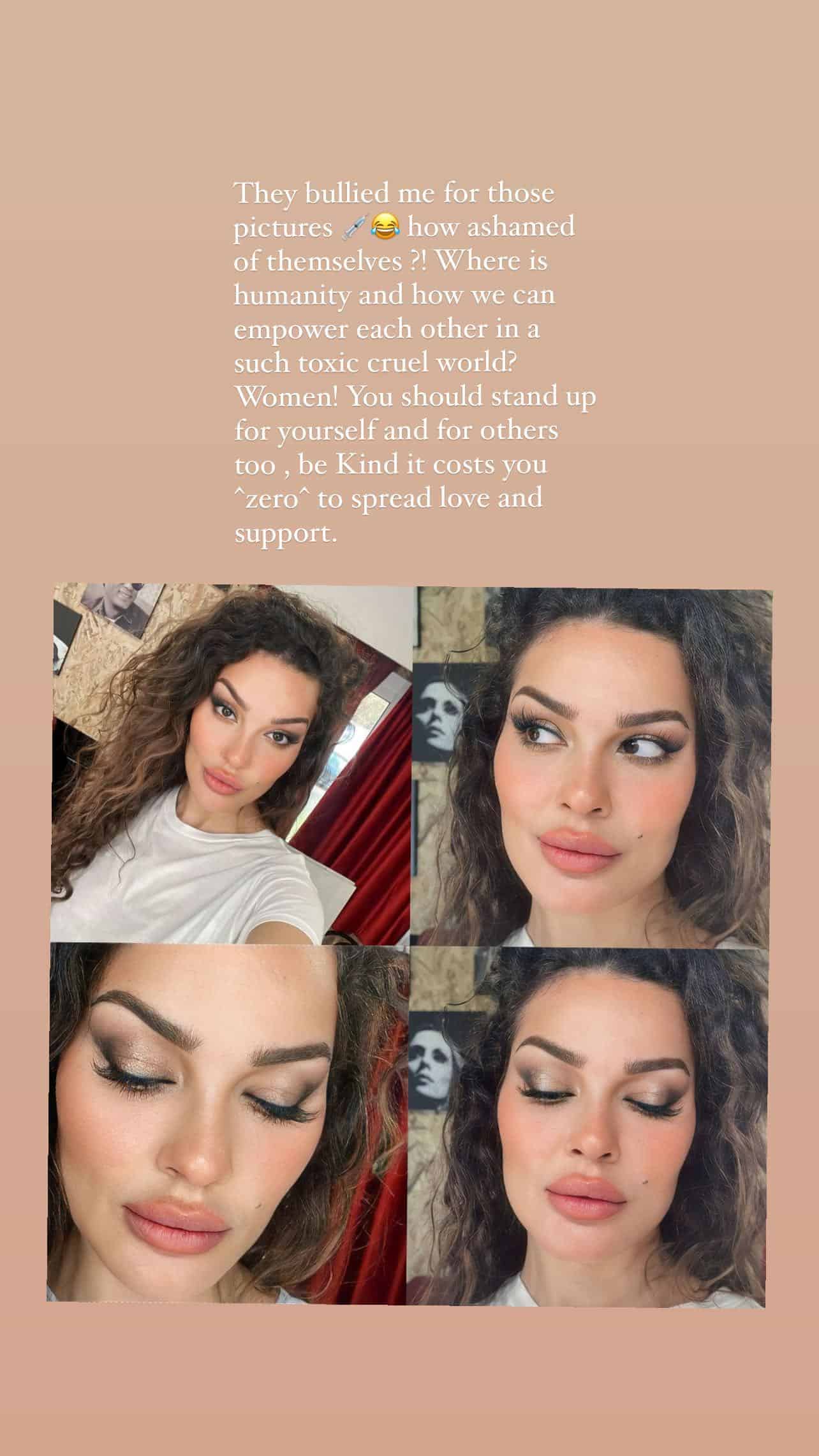 وهو ما دفع نادين لوصف ما تعرضت له بـ”التنمر”، قائلةً عبر خاصية القصص المصورة: “يتنمرون عليَّ بسبب تلك الصور.. ألا يخجلون من أنفسهم أين هي الإنسانية؟”