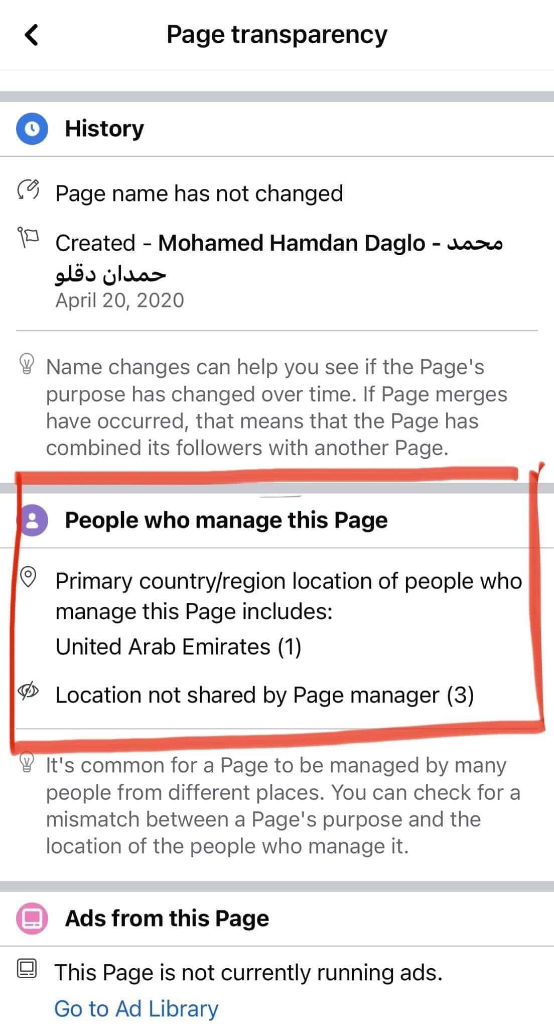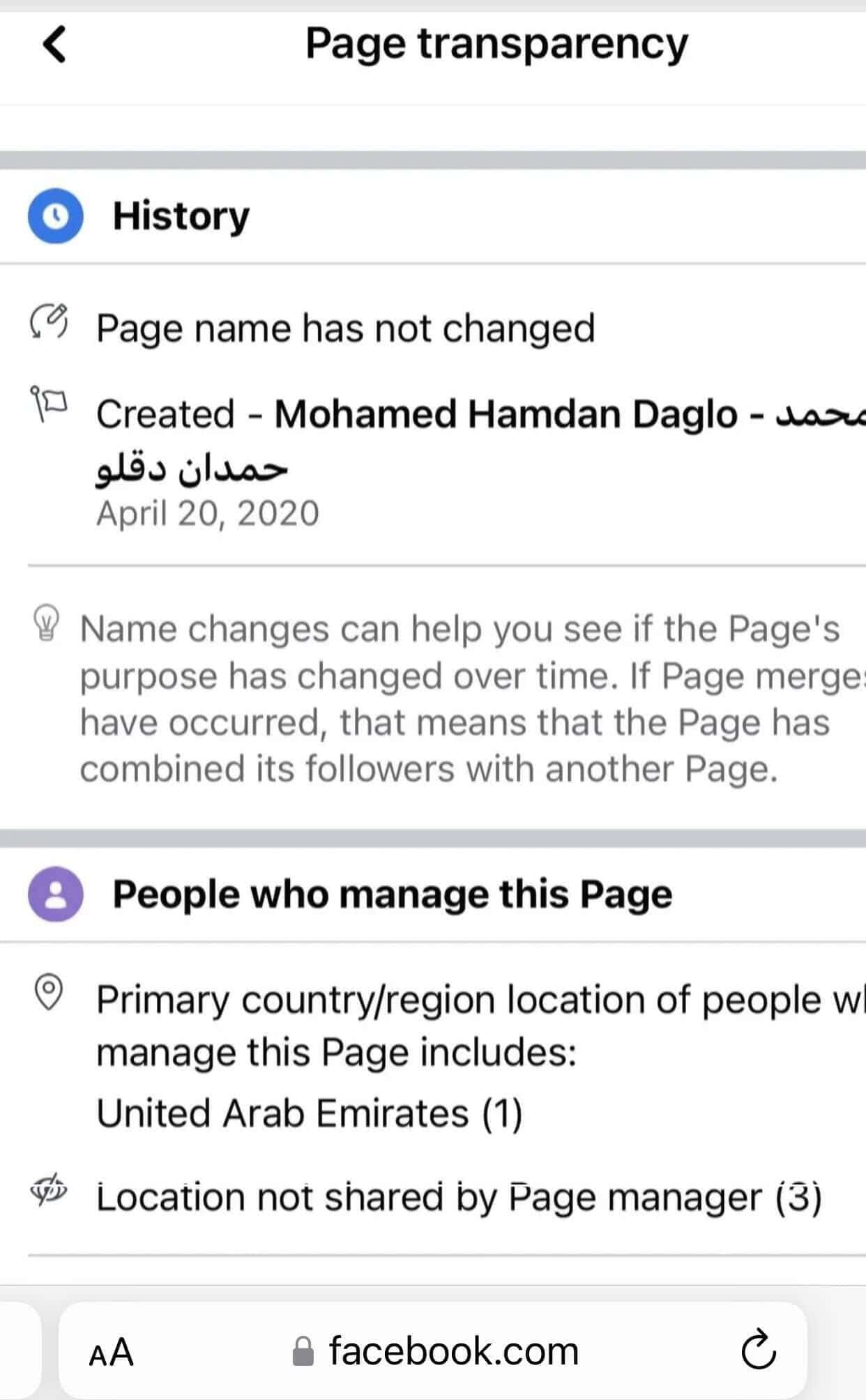 وفي إطار الخدمة التي يقدّمها موقع “فيسبوك”، اتّضح أنّ الصفحة الخاصة بقائد قوات الدعم السريع تدار من الإمارات، وهو ما أكدته عملية البحث التي قامت بها “وطن“.