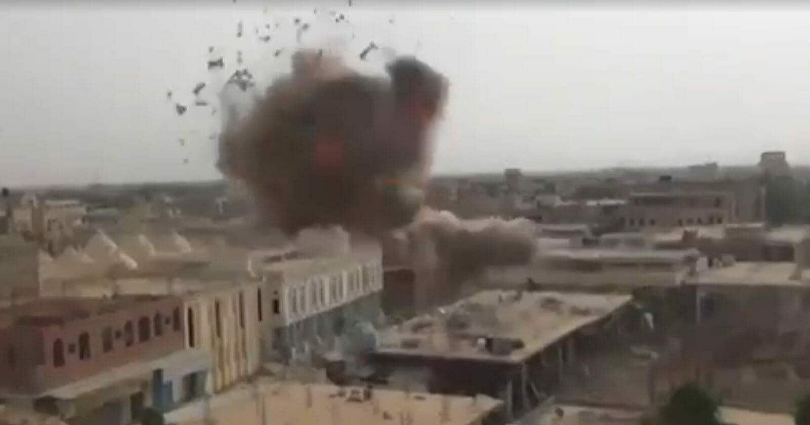 وبيَّن الفيديو الذي يضم عدة مقاطع، قصفاً جوياً على نقاطٍ مختلفة داخل مدنٍ،وذكر التعليق المرافق: “نسور الجو.. كاميرات تصور بدقة عالية للقصف على مقرات وأماكن تواجد القوات المتمردة.. دقة الاستهداف خيالية”.