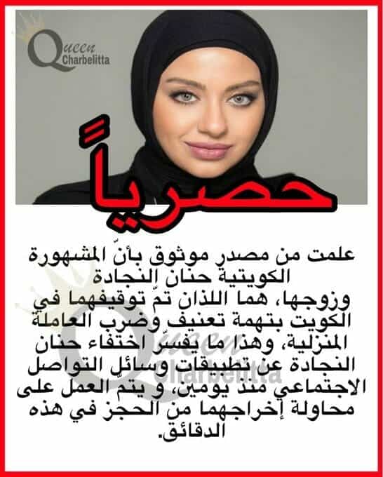 وأشارت شربليتا إلى أنّها علمت من مصدر موثوق، بأنّ المشهورة الكويتية حنان النجادة، وزوجها، هما اللذان تمّ توقيفُهما بتهمة تعنيف وضرب العاملة المنزلية.
