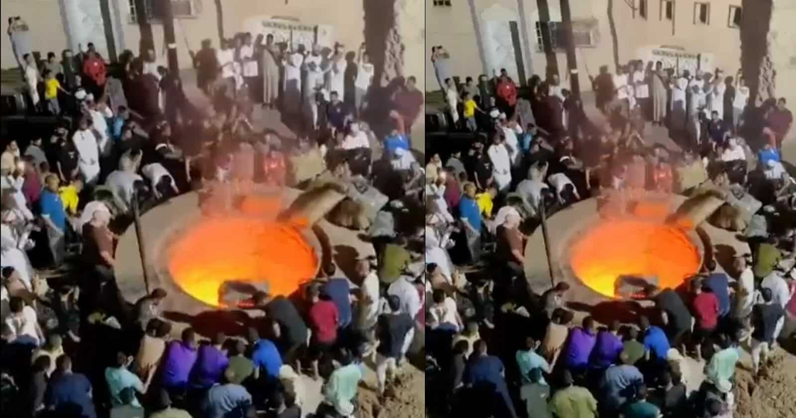 وأظهر مقطع فيديو متداول قيام العديد من الأشخاص في سلطنة عمان، بإلقاء اللحوم في حفرة من النار الملتهب.