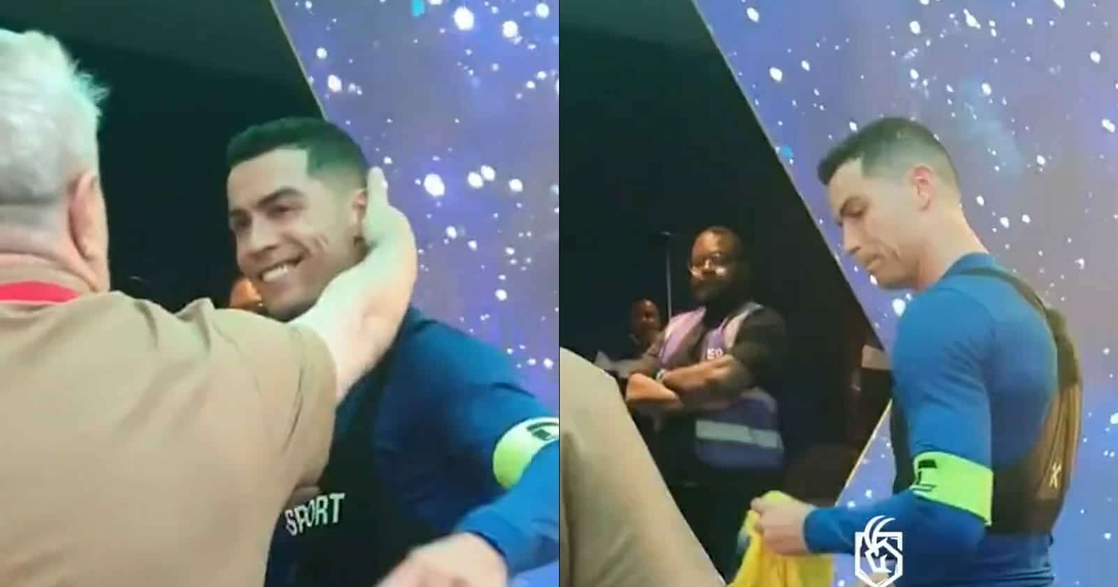وأظهر الفيديو ردة فعل طيبة من رونالدو، حيث التفت إليه مبتسماً ثم خلع قميصه وأعطاه إياه قبل أن يحتضنه ويربّت على كتفه، وهو ما أثار تفاعلاً واسعاً.