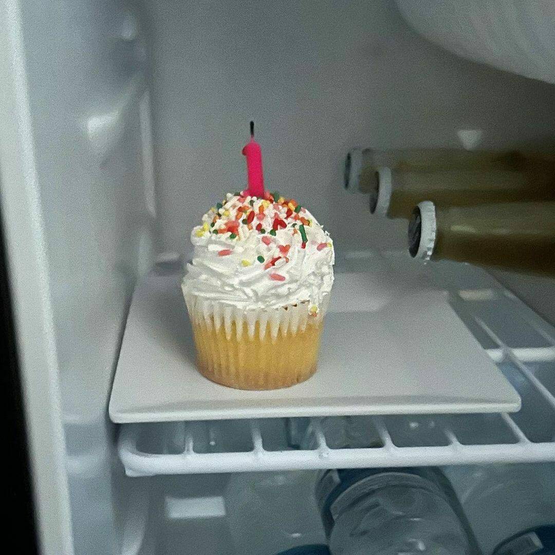 وبدأت كنزي عمرو دياب الصور بلقطة تجمعها بحبيبها في سوبر ماركت، ثم صورة تورتة صغيرة في ثلاجة مليئة بزجاجات البيرة.