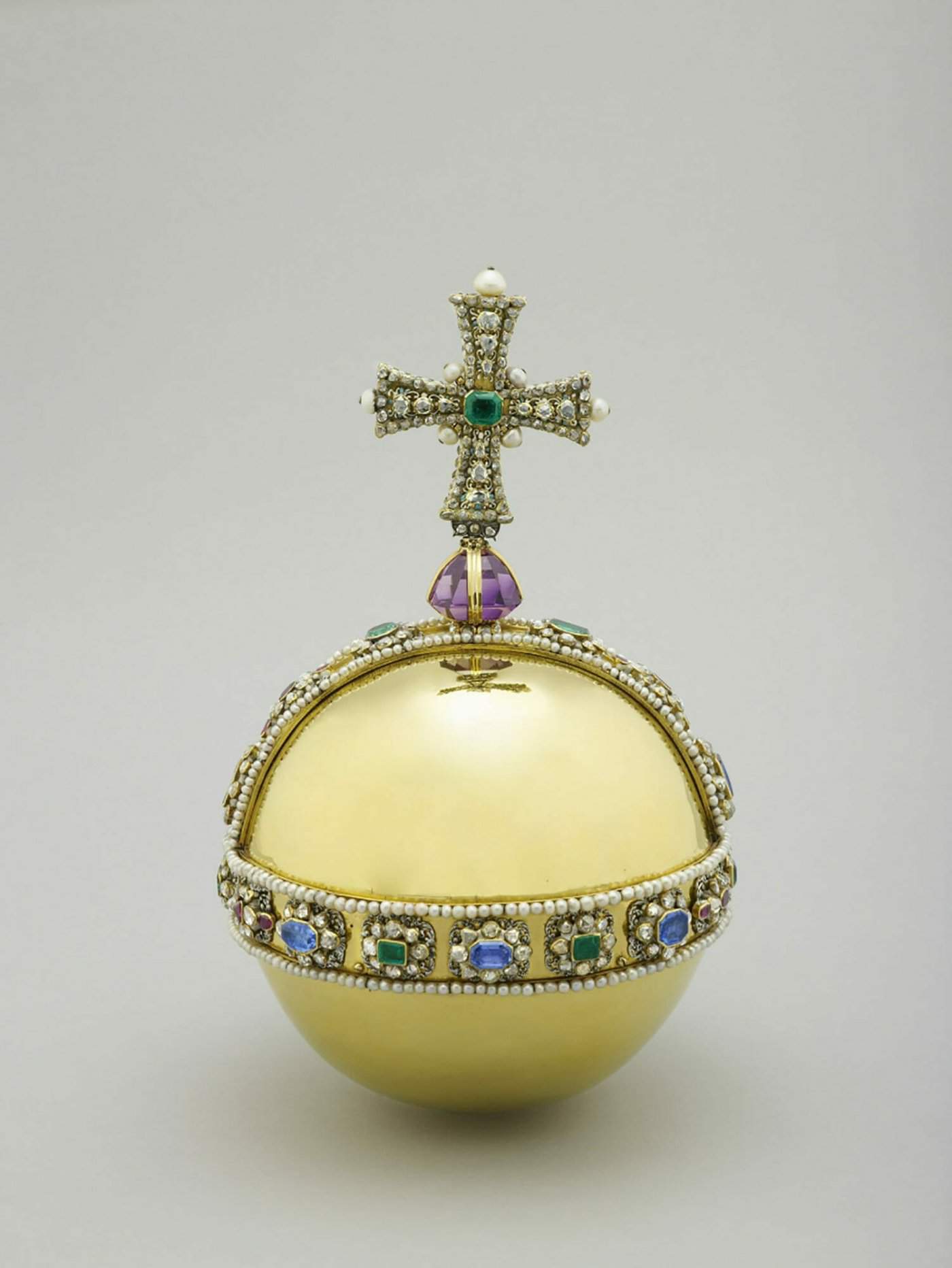 ويعلو التاج كرة ذهبية وصليب، ويرمزان للعالم المسيحي، وهو مصنوع من إطار من الذهب الخالص مُرصّع بالياقوت الأحمر، والجمشت، والزفير، والعقيق، والتوباز، والتورمالين.