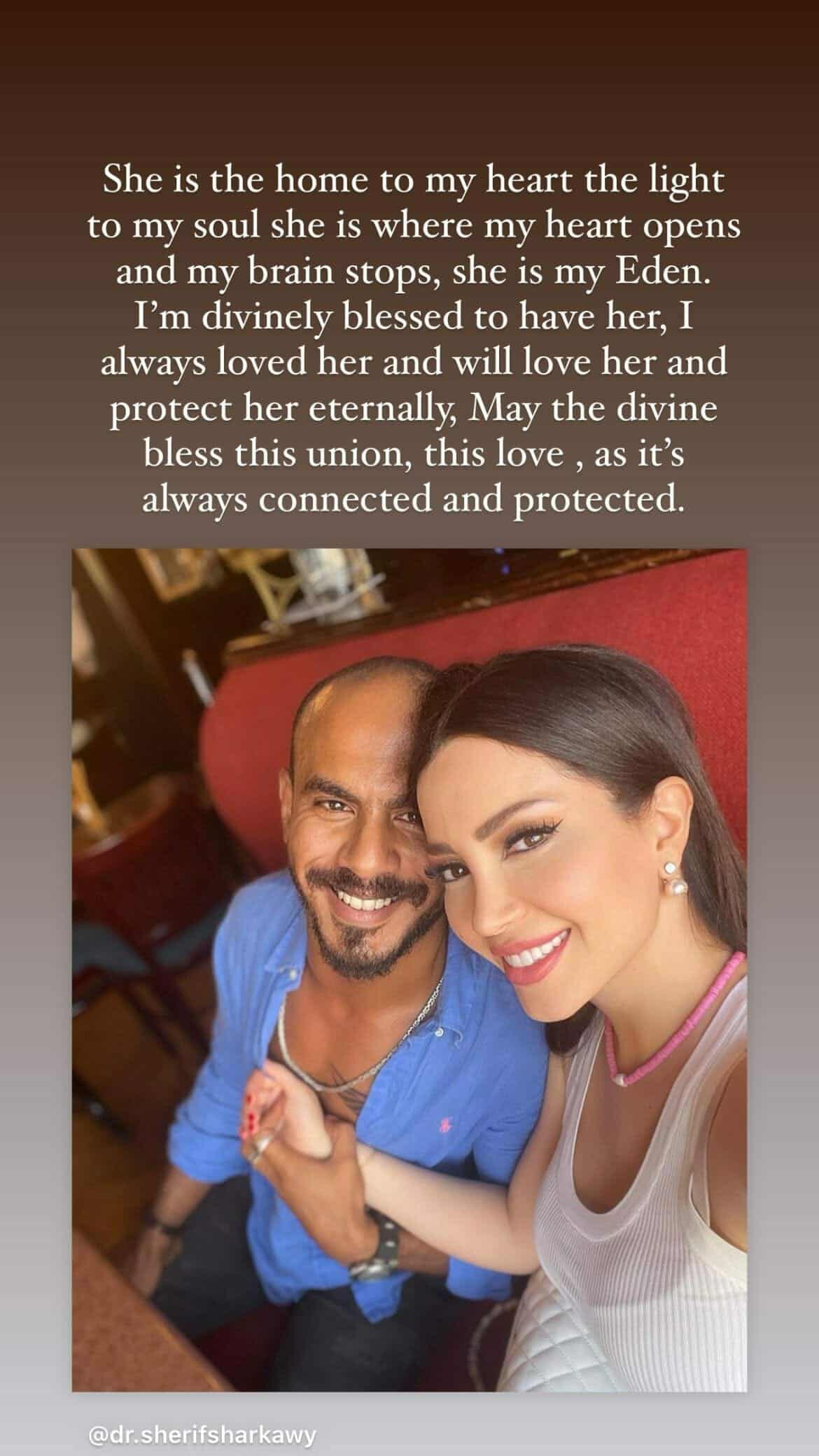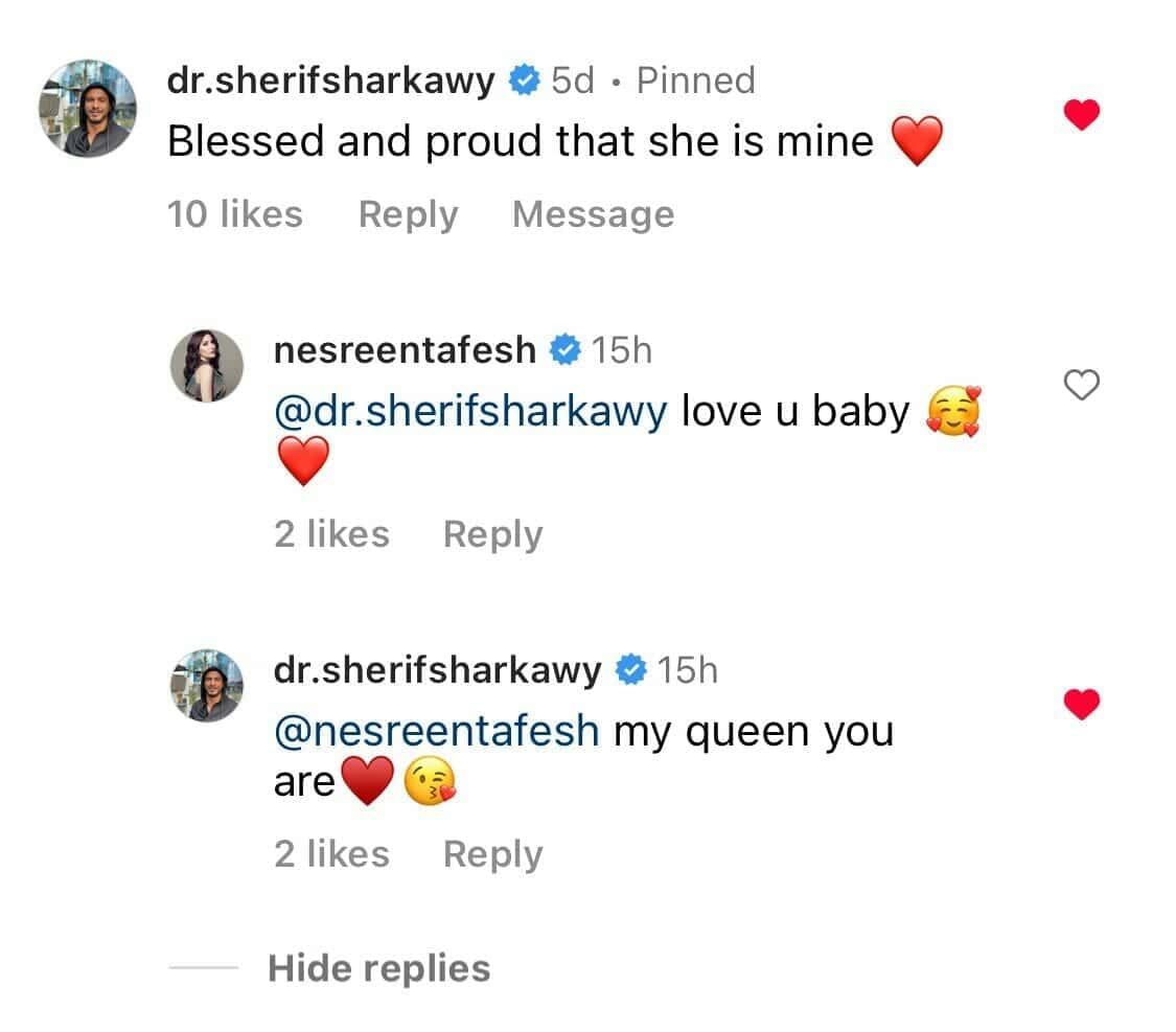 وقبل أيام، نشر شريف شرقاوي، زوج نسرين طافش، صورةً لها عبر خاصية الستوري على “انستجرام”، وقال: “هي نور روحي، هي المكان الذي ينفتح فيه قلبي ويتوقف عقلي”.