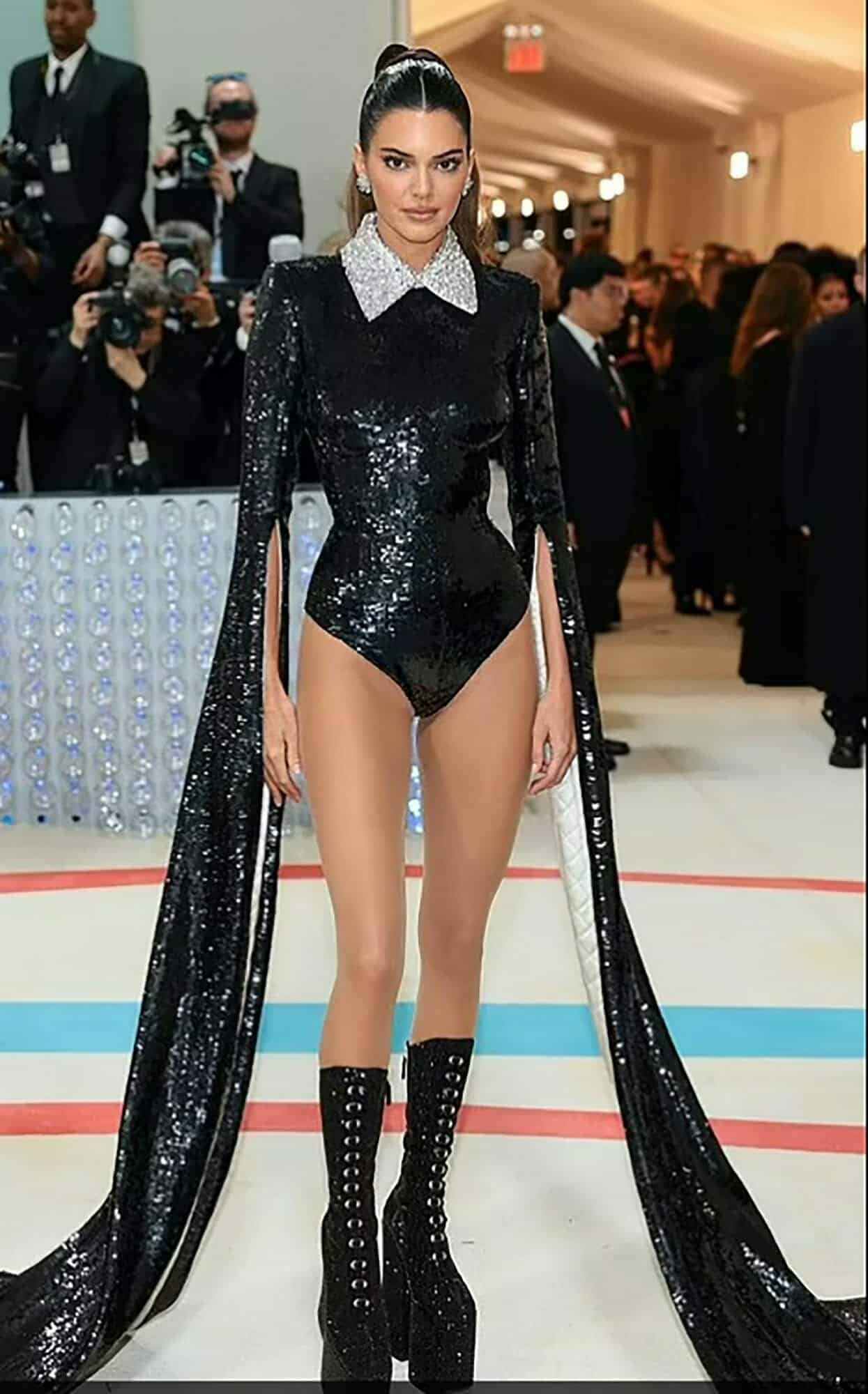 وفي وقت سابق من الليل، ارتدت كيندال أيضًا عرضًا رائعًا للغاية في بدلة سوداء مطرزة بأكمام بطول الأرض وياقة فضية لامعة وهي تتأرجح في السجادة الحمراء في Met Gala.