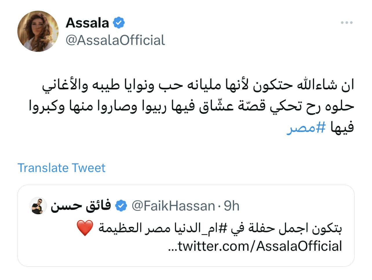 وكتب فائق حسن: “بتكون اجمل حفلة في أم الدنيا مصر العظيمة”.